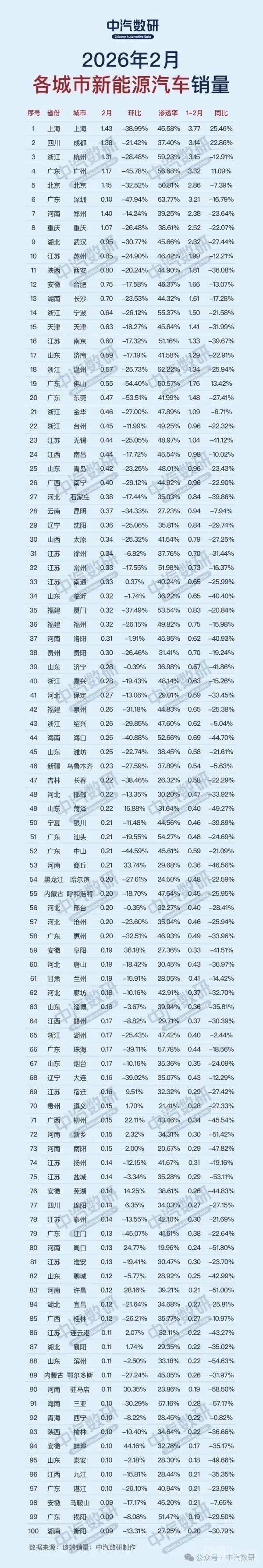 【CNMO科技消息】近日,中汽数研发布了2月各大城市新能源汽车销量TOP100。CNMO注意到,2月新能源乘用车终端销量43.0万辆,环比下滑23.8%,同比下滑34.4%。