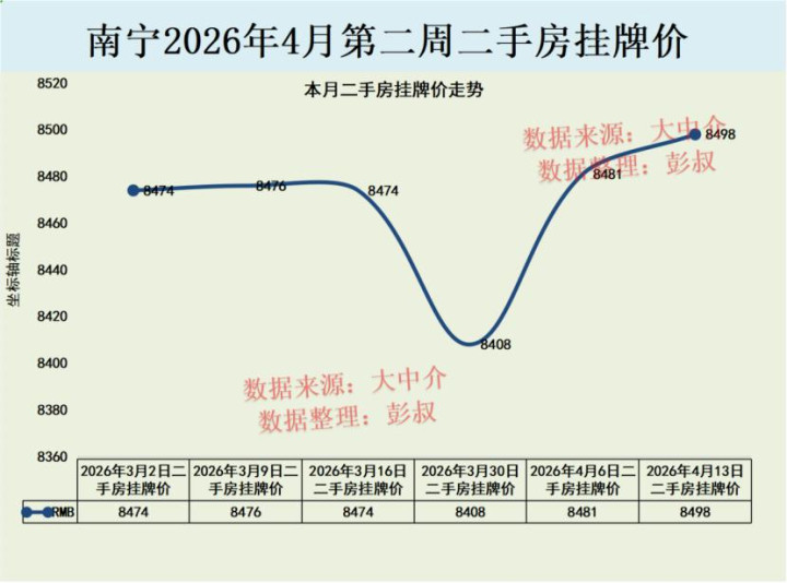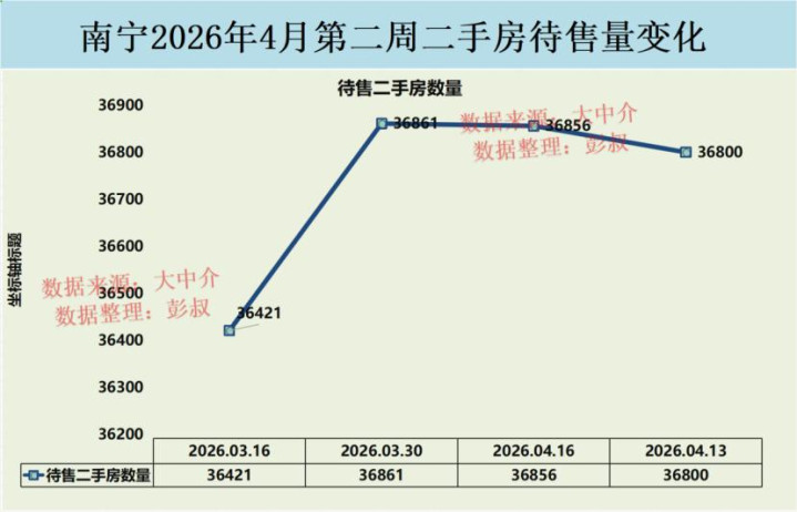 南宁楼市的待售二手房数量从2026年3月16日到4月13日里面,待售二手房数量从36421套变成了36800套,待售二手房还是小幅度的上涨了一些。
